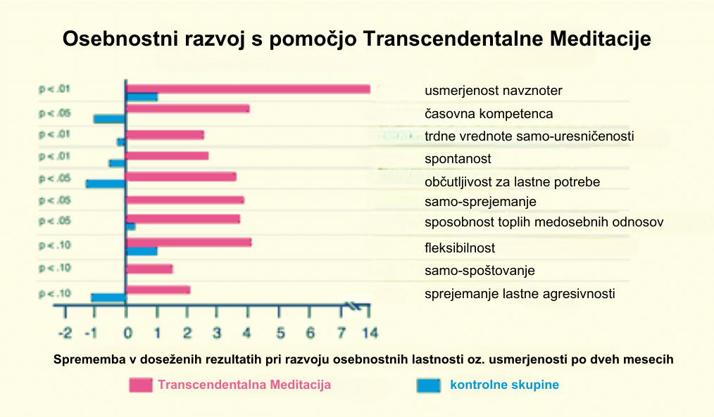 Statistična raziskava o vplivu TM na osebnostni razvoj je pokazala, da so osebe, ki so prakticirale TM v primerjavi s kontrolno skupino izkazale znatno izboljšanje osebnostnih značilnosti, ki prispevajo k integraciji in stabilnosti osebnostne rasti in zaznamujejo stopnjo samo-uresničevanja na vseh področjih življenja: notranjo naravnanost, časovno kompetenco, visok vrednostni sistem, spontanost, občutljivost za lastne potrebe, sposobnost vzpostavljanja toplih medosebnih odnosov, fleksibilnost, samo-spoštovanje in sprejemanje lastne agresivnosti. Meritve so bile opravljene preden so osebe začele prakticirati TM in po dveh mesecih prakticiranja.Ref.[17]