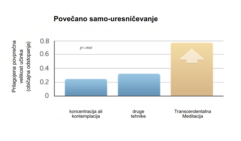 Statistična meta-analiza vseh znanstvenih študij, ki so bile opravljene o učinkih različnih tehnik meditacije na samo-uresničevanje (skupno 42 študij, 18 od teh so bile TM študije) je pokazala, da je učinek TM na samo-uresničevanje znatno večji od drugih tehnik meditacije ali relaksacije. Povprečen učinek TM je bil 3 do 4 krat večji. (učinek=0.08 p=0.0002).Ref[15].